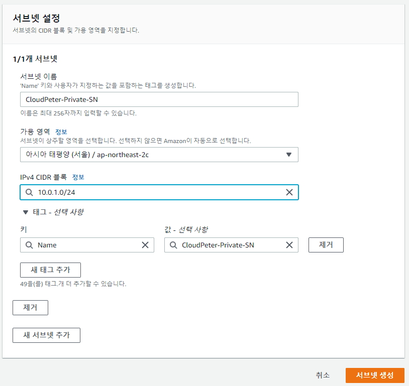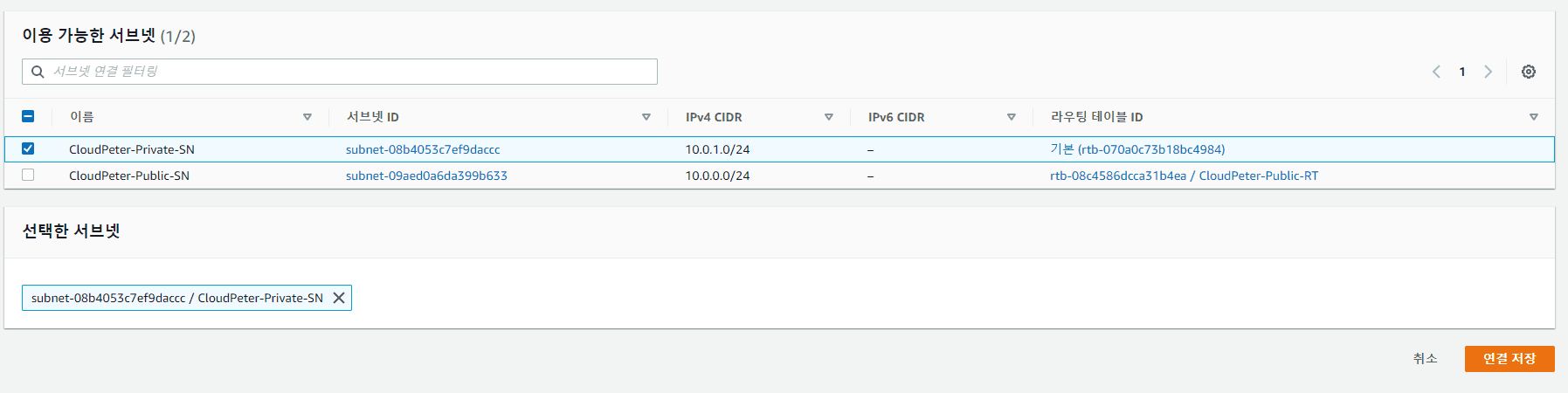 프라이빗 서브넷 (CloudPeter-Private-SN) 선택