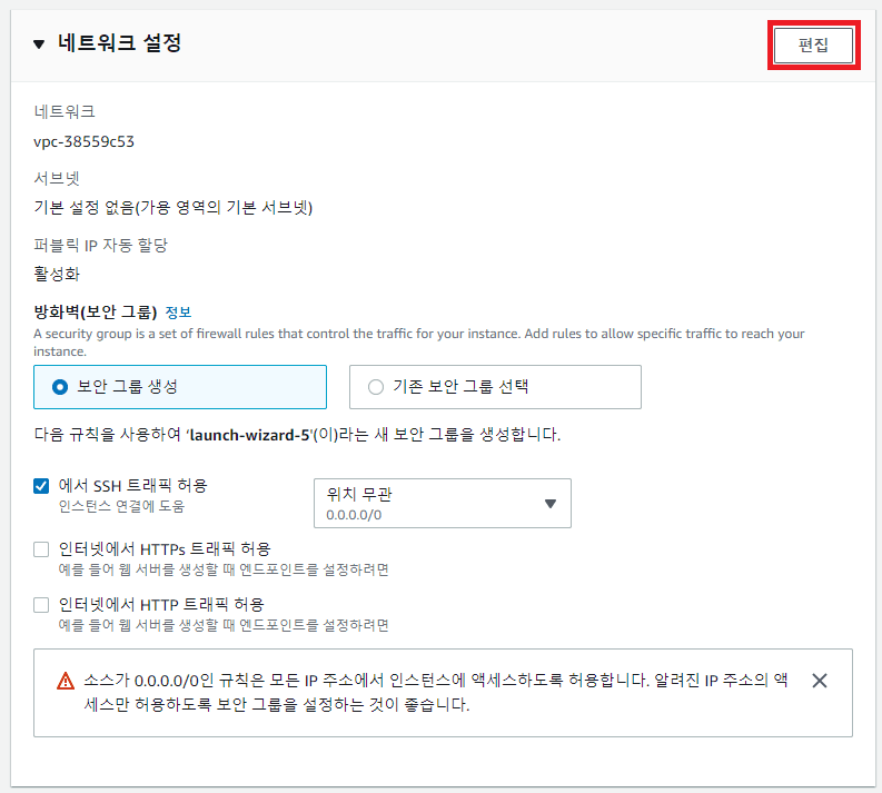 VPC: 생성한 VPC 선택 (CloudPeter-VPC) 서브넷: 생성한 Subnet 선택 (CloudPeter-Public-SN) 퍼플릭 IP 자동 할당: 활성화