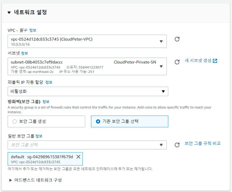 이름: Private-EC2 네트워크: 생성한 VPC 선택 (CloudPeter-VPC) 서브넷: 생성한 프라이빗 서브넷 (CloudPeter-Private-SN)