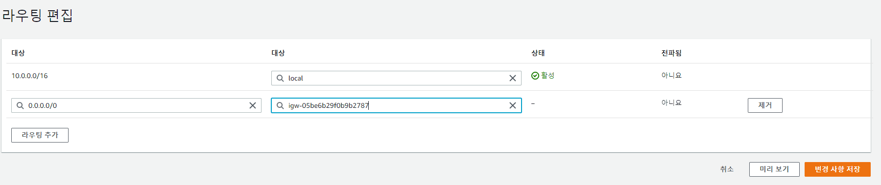 | 퍼블릭 라우팅 테이블 경로 추가 |