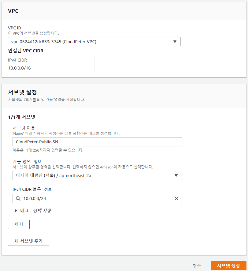 서브넷 생성 VPC ID: 생성한 VPC 선택 (CloudPeter-VPC) 이름 태그: CloudPeter-Private-SN 가용 영역 설정: ap-northeast-2c IPv4 CIDR 블록: 10.0.1.0/24