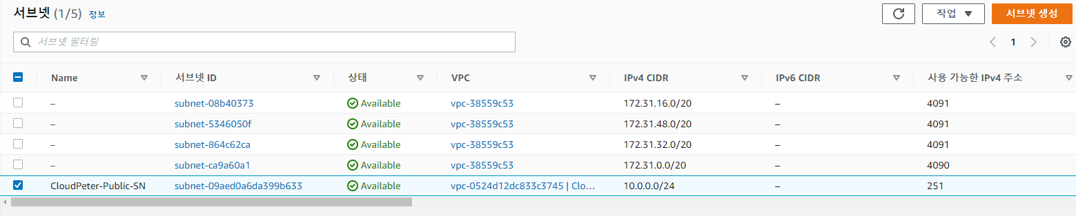 사용 가능한 VPC: 생성한 VPC 선택 (CloudPeter-VPC)